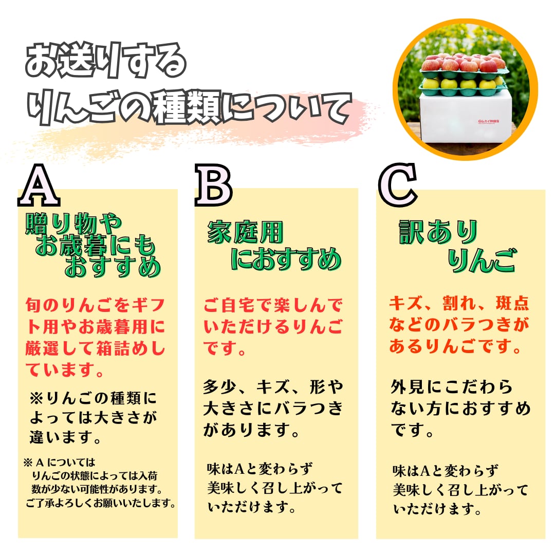 家庭用りんご・・・ご自宅で楽しんでいただけるりんごです。多少、キズ、形や大きさにバラつきがありますが,味はAと変わらず美味しく召し上がって頂けます。