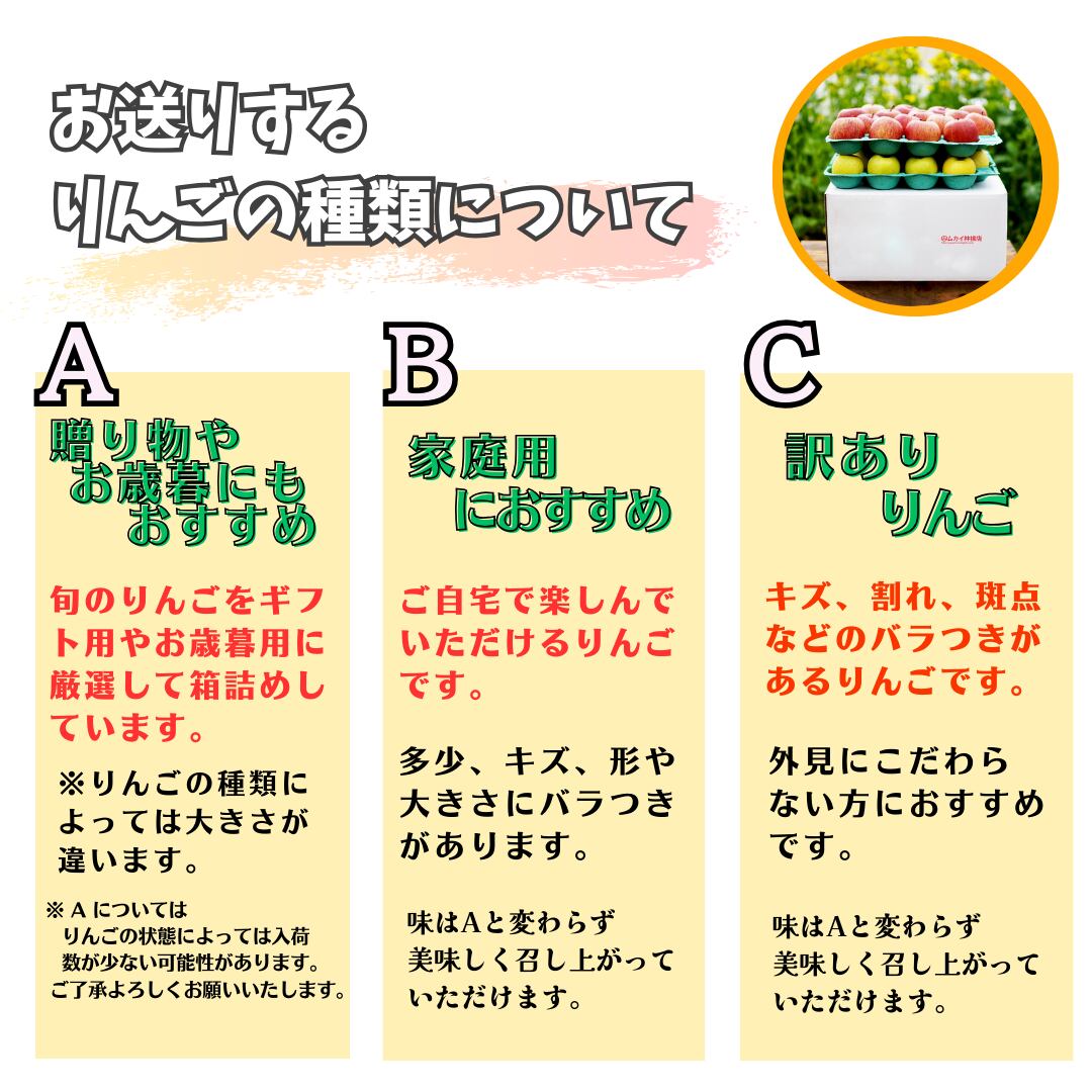 訳ありりんご・・・味はAと変わりはありませんが、キズ、割れ、斑点などのバラつきがあるりんごです。外見にこだわらない方におすすめです。